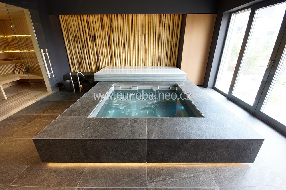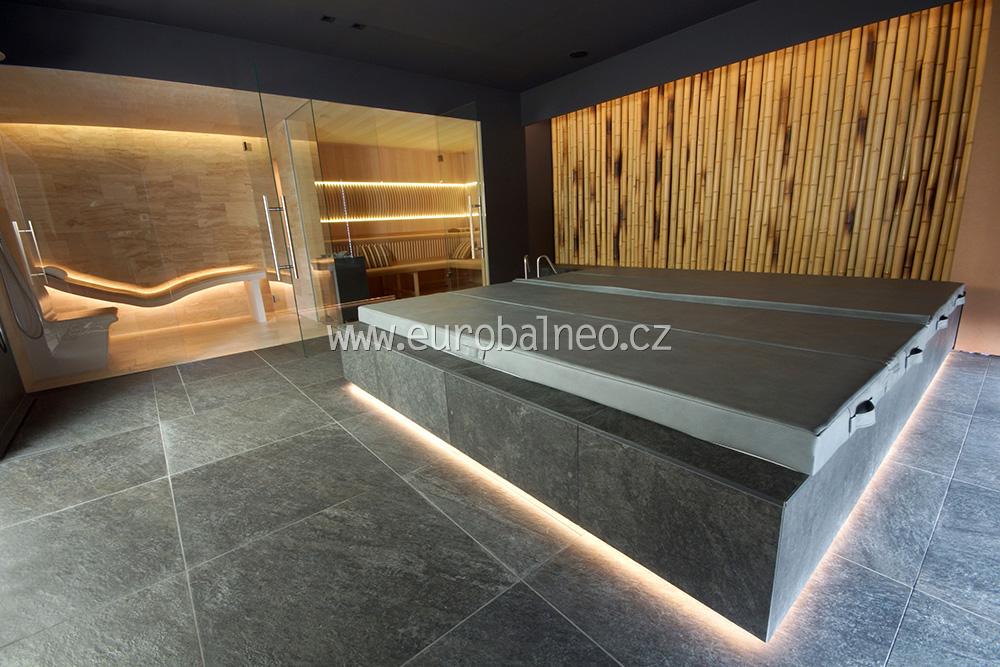 Aby se do vířivky lépe vstupovalo, zapustili jsme ji částečně do podlahy. A její hrany jsme nasvítili LED barevnými pásky. Vodu lze, samozřejmě, barevně osvítit také. Ale to není podstatné. Největší výhodou této vířivky je totiž její kryt.