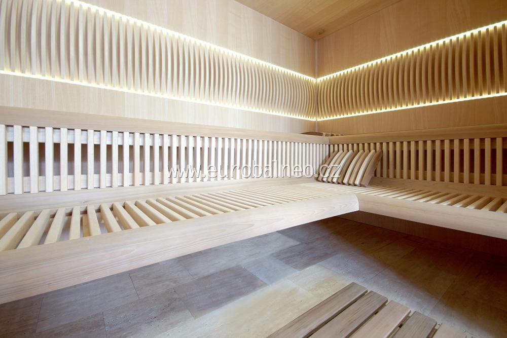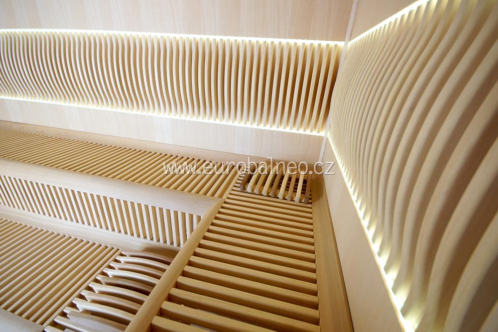 Sauna Future představuje nejvyšší model naší nabídky a vyniká vysokými možnostmi nadstandardní výbavy. Tato sauna má pohodlné lamelové lavice z afrického dřeva Abachi, jehož zvláštností je to, že neabsorbuje teplo a tudíž nepálí. Opěrky zad jsou podsvícené s možností volby barvy světla. Stěny sauny jsou z cedrových panelů.